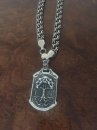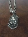 The photo shows a double-sided silver pendant with a wolf on one side and the "Tree of Life" on the other side, an amulet made of sterling silver around the neck.